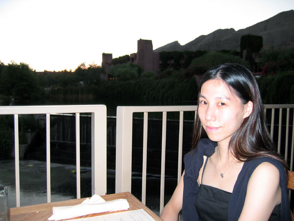 View of waterfall + hotel from the Flying V Bar & Grill patio.